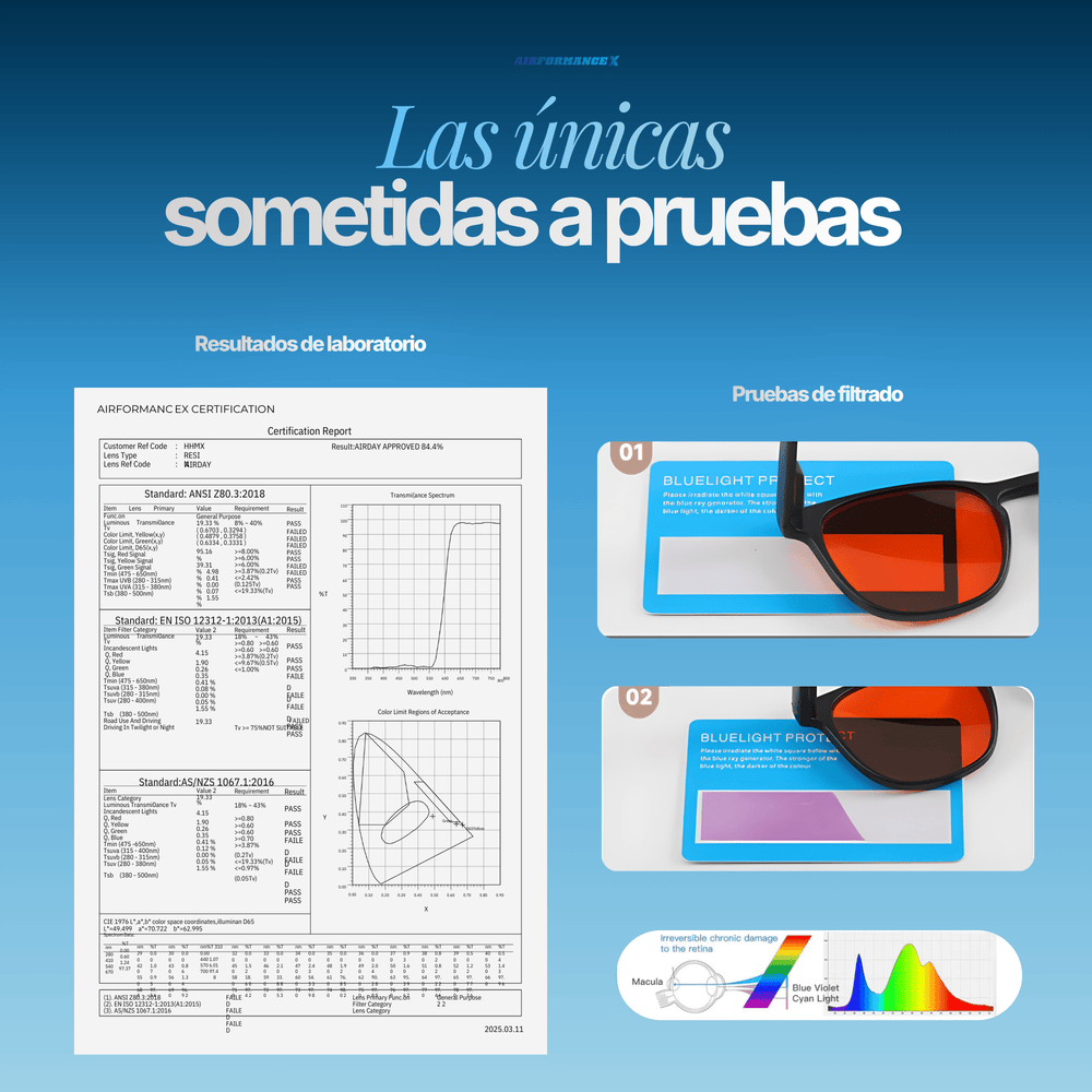 AirDay® incorpora un filtro óptico selectivo de precisión diseñado para reducir la exposición a luz azul de alta energía (400–455 nm), el rango más asociado a fatiga visual, estrés ocular y sobrecarga cognitiva durante el uso de pantallas. A diferencia de gafas nocturnas o filtros extremos, AirDay® protege sin apagar el cerebro, manteniendo claridad visual, contraste natural y rendimiento mental durante el día.