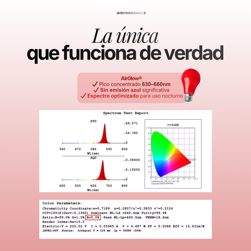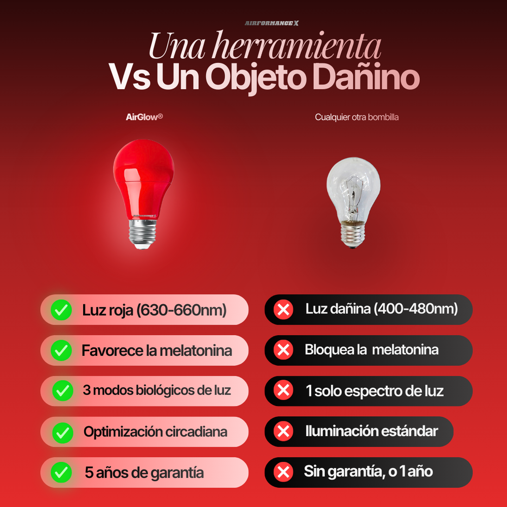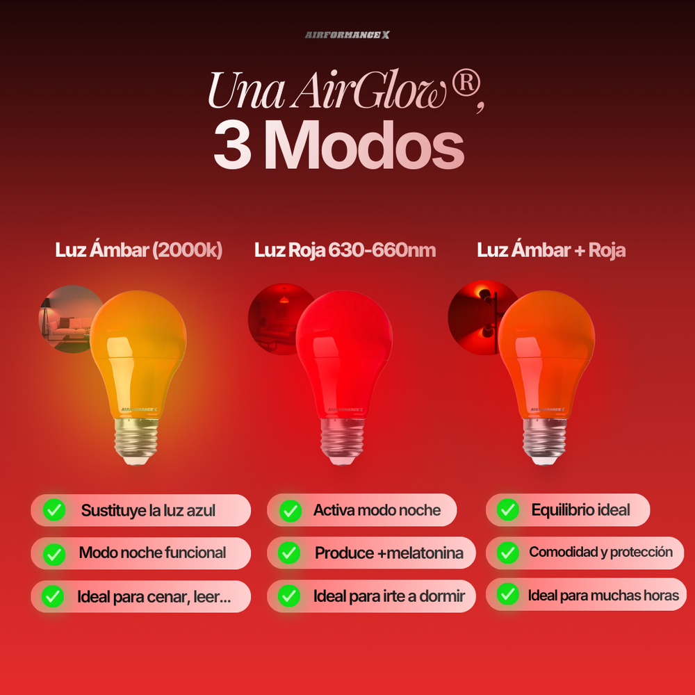La mayoría de hogares utilizan iluminación LED blanca, que suprime la melatonina y mantiene el cerebro en estado de alerta. AirGlow™ elimina ese estímulo y crea un entorno lumínico adecuado para descansar y para la reparación nocturna.